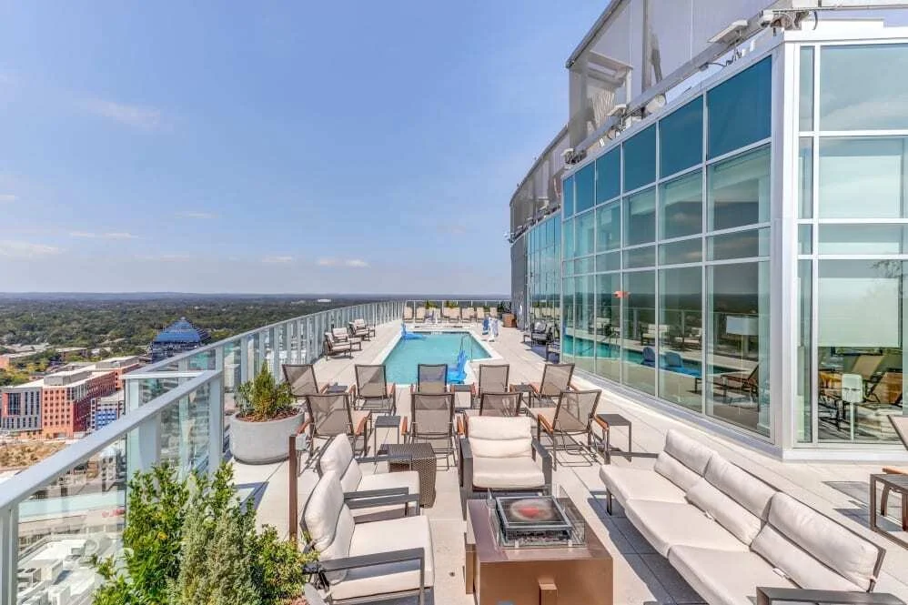 Residents of One City Center enjoy high-end living, panoramic views of downtown Durham, and a host of upscale amenities. From a swimming pool and hot tub on the roof to a chef-ready kitchen, we’ve got you covered! Take your pup to the private dog run, hang with friends and family in the resident lounge, or enjoy chilling out on your spacious balcony. With our floor-to-ceiling glass windows, stainless-steel appliances, and quartz countertops, our Durham one and two-bedroom homes radiate lavishness.